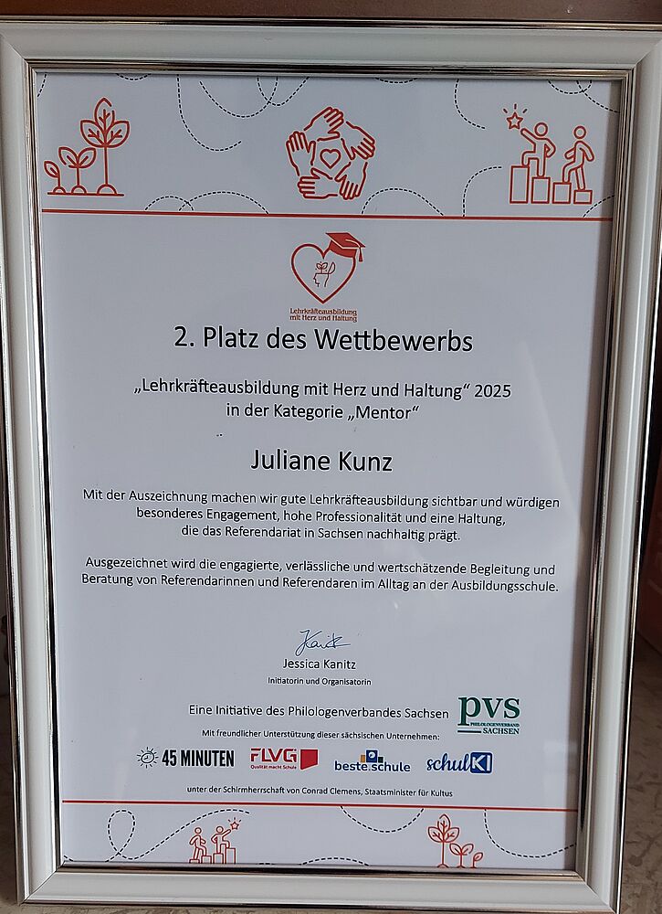 Am Samstag, dem 28. Februar 2026, wurde unsere geschätzte Kollegin und Lehrerin, Frau Kunz, im Gymnasium Dresden-Klotzsche mit dem Sächsischen Ausbilderpreis in der Kategorie "Mentorin" ausgezeichnet. Die feierliche Verleihung durch Ministerpräsident Michael Kretschmer würdigt jene Lehrkräfte, die durch herausragendes Engagement und fachliche Kompetenz die nächste Generation von Pädagogen prägen.